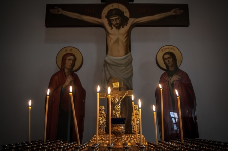 Icons and lit candles inside a dimly lit Orthodox church
