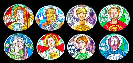 set of ancient vibrant colorful stained glasses with saints combined in one file, very good detalisation (church in Narva, Estonia)