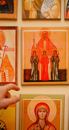 Religious paintings in monastery in Pogradec, Albania. Religion art and history concept.