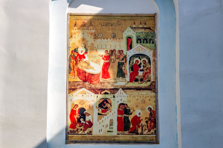 Ivanovskoe, Russia - August 2018: Fresco on Orthodox themes on the facade of the building of the old church of the Nativity of the Blessed Virgin Mary of the 18th century in the village of Ivanovskoe.