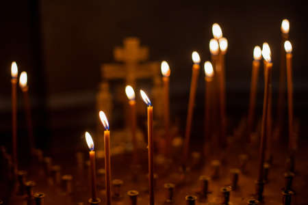 Church candles standing in the temple on the stand during the service. Religious Orthodoxy and Catholicism symbol.