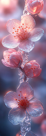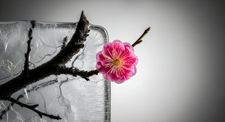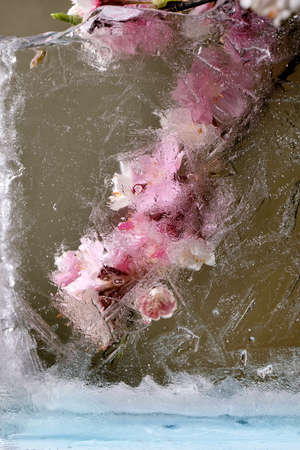 Beautiful flowers pink blooming sakura cherry branch in transparent ice block. Frozen beauty concept. Floral greeting card