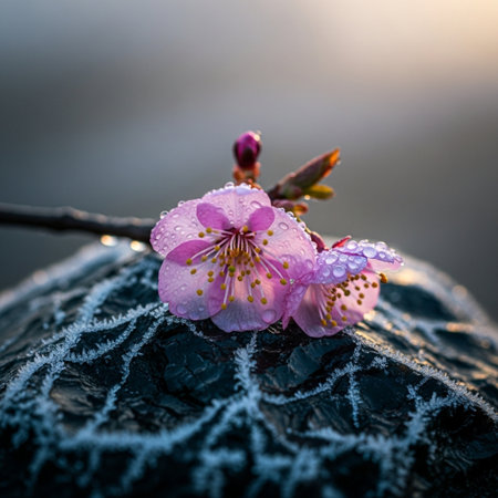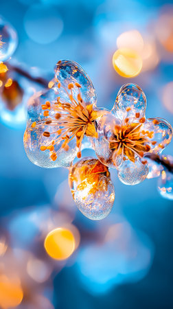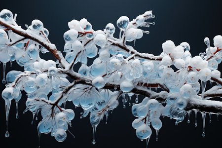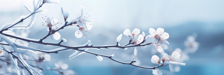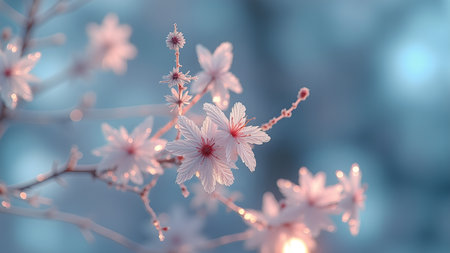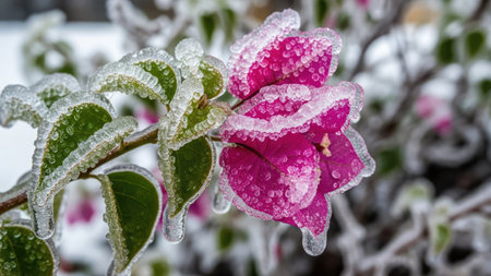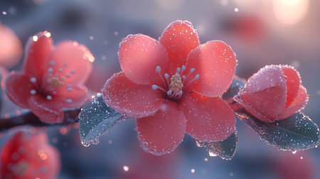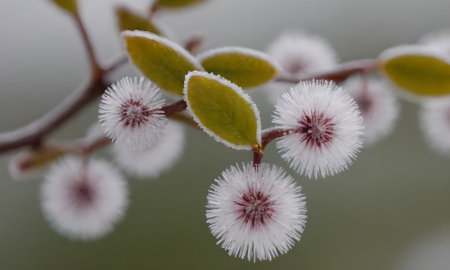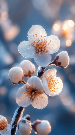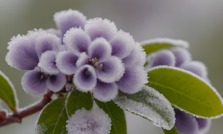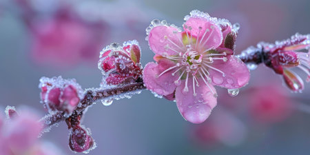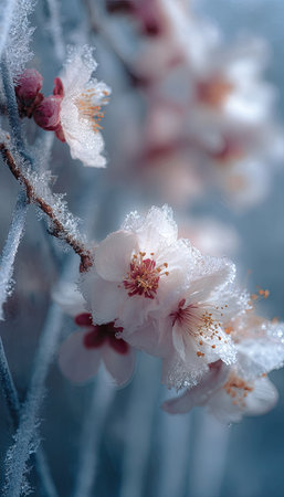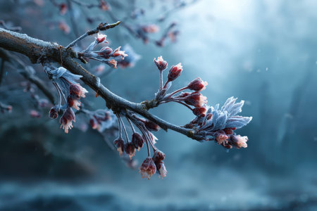 Delicate flower buds cloaked in icy crystal frost adorn a wintery branch, capturing nature's quiet resilience amidst the cold season.