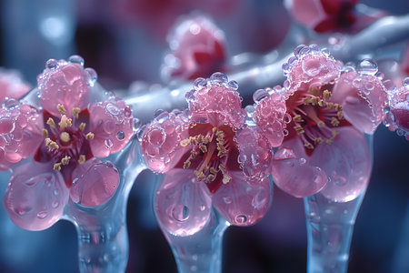 Crystal Blossoms: Dewy Floral Delicacy. Transparent flowers with dewdrops, close-up with a soft blue background