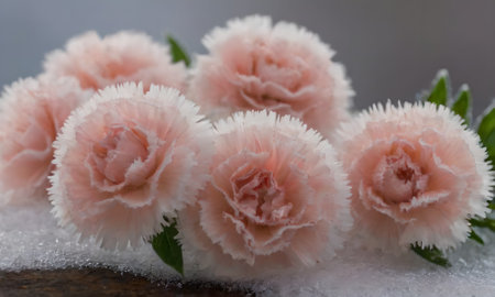 Carnation flowers covered with hoarfrost, close-up