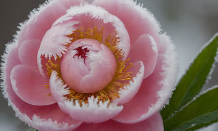 pink peony flower in the snow, closeup of photo