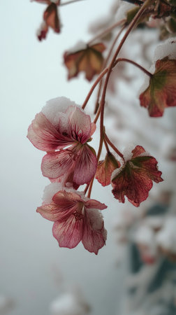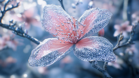 Frosted pink flower blossom with winter background nature image