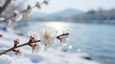 Spring blossom under the snow. Branches with bloomed flowers under late snow. Macro shot with shallow depth of field.