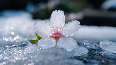 Frozen beautiful cherry flower. blossomsin the ice cube