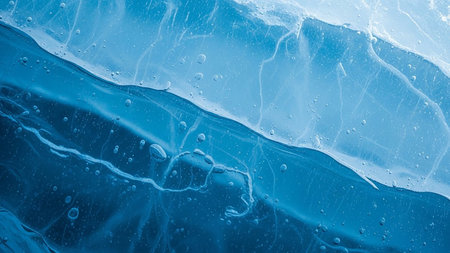 Abstract close up of layered blue ice with trapped air bubbles and cracks, frozen texture.