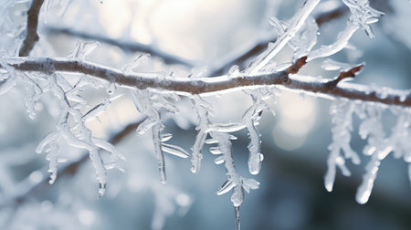 Icy branches covered in frost against a blurred winter background, perfect for copy