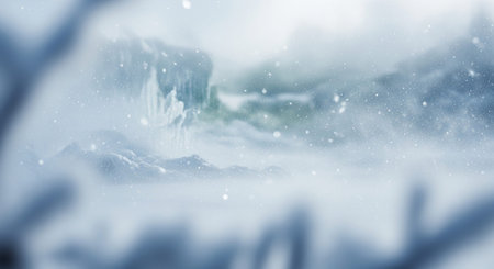 A soft, ethereal winter scene with falling snow, blurred icy formations in the foreground, and distant misty mountains.