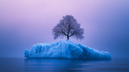 Solitary tree on icy island in calm water at dawn, serene and mystical landscape. Environmental and solitude concept