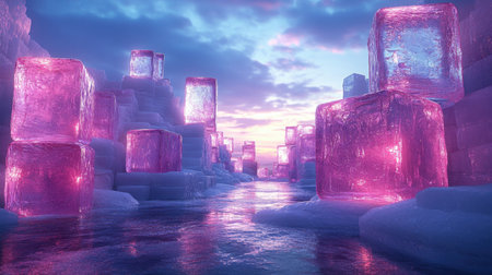frozen water with an ice finish, resembling a scene rendered in unreal engine. the golden light casts a warm glow, complemented by hints of light maroon and orange. this captivating image, reminiscent of aleksey savrasov's artwork, captures the essence of environmental activism. the selective focus adds depth to the 32k uhd resolution, making it a visually stunning composition. ai generated
