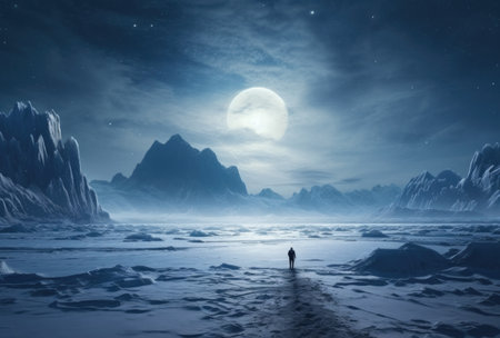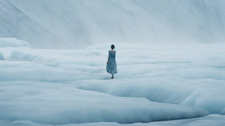 a single person in blue walks alone on top of a snow-covered icy ocean, creating a surreal fashion photography scene. the image resembles a matte painting with a soft, muted color palette. the environment reflects the work of an environmental installation artist, while the cinematic stills capture the flowing textures. the overall aesthetic is reminiscent of the style of burne-jones. ai generated