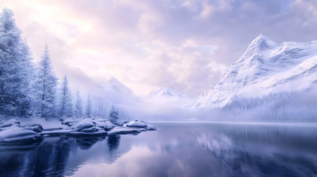 Experience the beauty of a tranquil winter landscape featuring snow-covered trees and a calm lake, all set against a breathtaking mountain backdrop under a misty sky.
