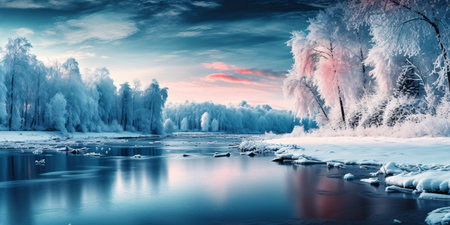 Serene winter landscape with frosted trees glisten under a soft, pastel sky and calm water