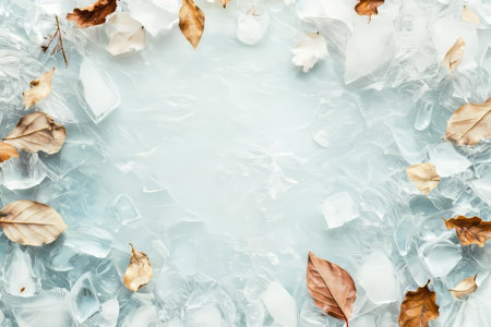 Shimmering ice surface with frozen water shards and dried leaves in a tranquil winter setting