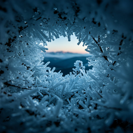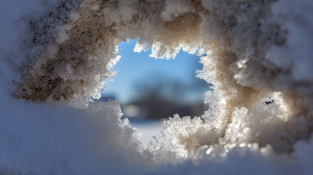 A captivating view through a snow crystal frame, revealing a bright winter landscape against a clear blue sky. This image embodies the beauty of nature's winter wonder.