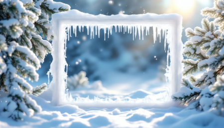Snowy winter scene features a frame of ice with icicles hanging and snow covered pine trees Perfect for winter holiday cards and winter themed designs.