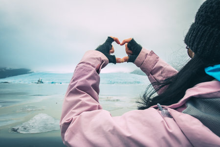 Woman tourist show heart symbol sign on Fjallsjokull glacier lagoon in Iceland. Save earth, love planet concept, reduce carbon dioxide, reduce global warming, protect glaciers