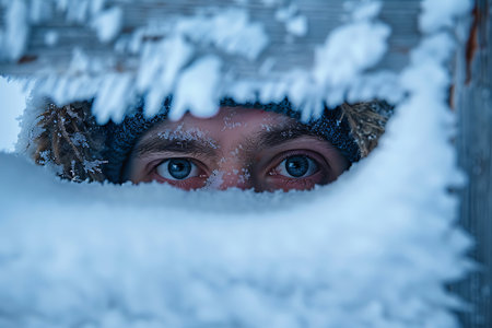 Generative AI Image of Man Seeking from Home Hole with Snow Covered at Wall Winter Season Wallpaper