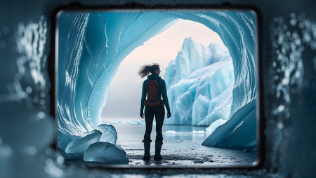 Female hiker admiring breathtaking ice cave formations in iceland. Ai generated image
