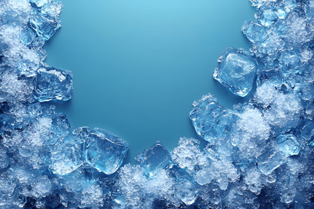A vibrant image featuring scattered ice cubes and crushed ice against a cool blue background. the contrast between the clear ice and the blue hue creates a refreshing and clean aesthetic, ideal for summer-themed designs and cooling product advertisements. Generative AI