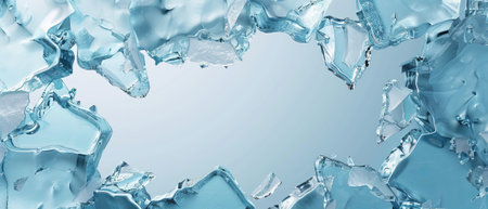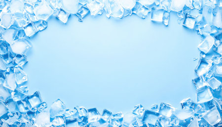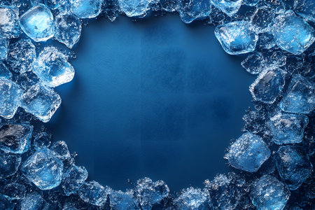 A captivating blue background framed by a border of clear, glistening ice cubes, creating an impression of coolness and freshness. ideal for designs related to cold beverages, refreshing themes, or winter concepts. Generative AI