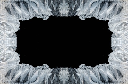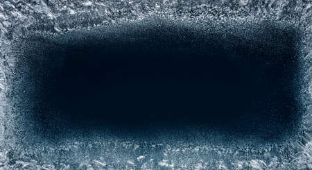Frost patterns on frozen winter window as a symbol of Christmas wonder. In the middle of the window is a misted space for your product or lettering. Christmas or New year background.
