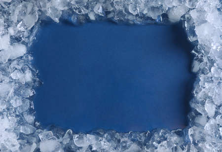 Frame of crushed ice on blue background, top view. Space for text