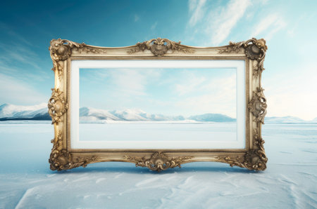 Baroque picture frame on the frozen lake. Winter landscape copy space background. AI generated image