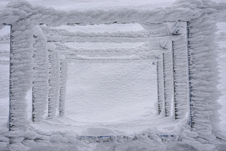 Winter ice window. Icy window to winter in snow. Icy visor over the window. vertical view.