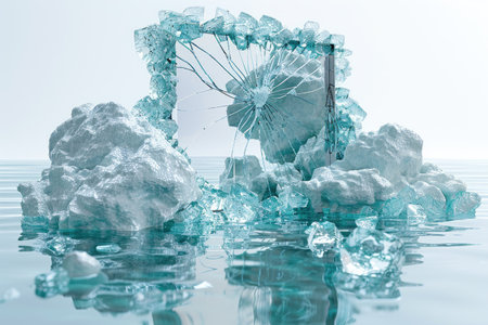 Broken Glass Mirror Surrounded by Ice in Water