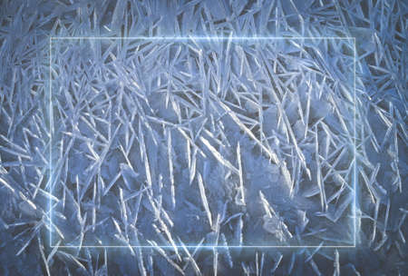 Natural winter ice background with a frame for inserting text. Abstract patterns on ice illuminated by the sun. Snow and frost.