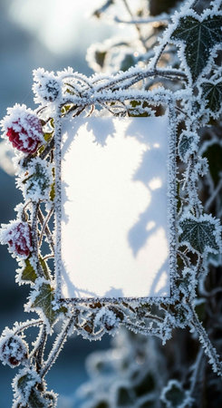 A wintery scene featuring a snow-covered board encircled by frost-coated branches and red berries. Perfect as a festive backdrop or holiday design with clear, spacious copy space.