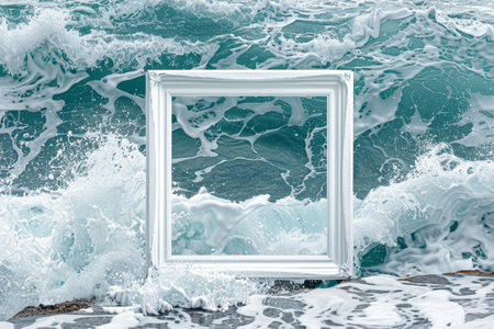A white square is floating in the ocean. The square is surrounded by water and the ocean waves. Concept of calmness and serenity