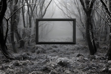 Picture frame in the foggy forest. Black and white image.