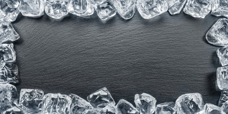 Natural stone black slate serving plate with ice cubes arranged as a frame. flat lay.