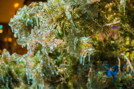 Transparent Christmas balls and icicles on the Christmas tree with a garland.