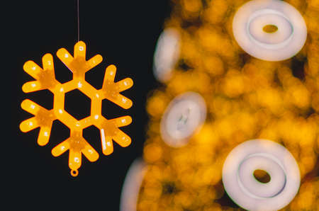 Partial focus of neon lights snow flake Christmas ornament with blurry Chirstmas tree background.