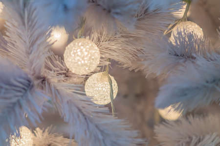 Christmas and New Year holidays background. White Christmas tree decorated with white balls. Celebration concept