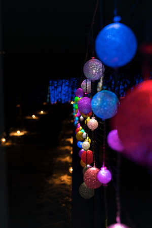 Christmas lights. Glowing garland with hanging stars and balls at night black background