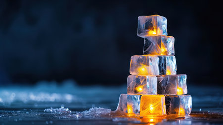 This artistic photo features a pyramid of ice cubes illuminated by warm lights, creating an intriguing contrast between cold and warmth, perfect for winter themes.