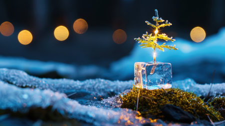 A captivating image of a delicate ice sculpture showcasing a tiny tree sitting on snowy ground, illuminated by soft bokeh lights. Ideal for winter themes.