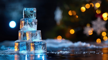 A creative arrangement of ice cubes stacked on a dark surface, complemented by soft Christmas lights and delicate snow, perfect for holiday themes.