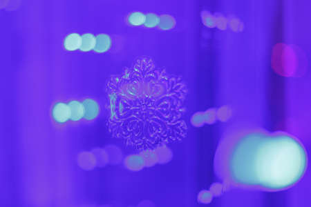 Blue bokeh on a lilac background with a blurred snowflake. Glittering lights are not in sharpness.