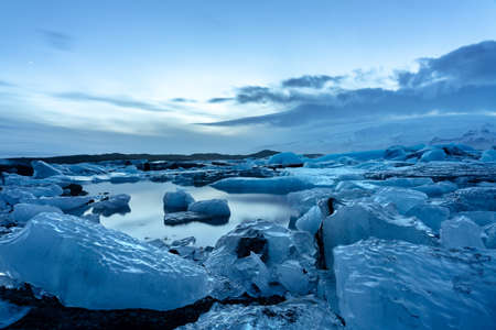 iceland glacier jokulsarlon in the evening icebergs floating on the cold peaceful water after sunset with dramatic sky