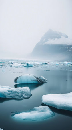 glacial lagoon with icebergs and misty mountains, serene wilderness scene. natural beauty and climate change concept