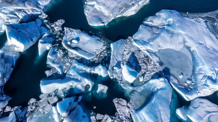 Glacial icebergs floating in blue water. Natural patterns and texture in cold ocean.
